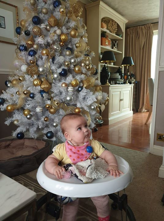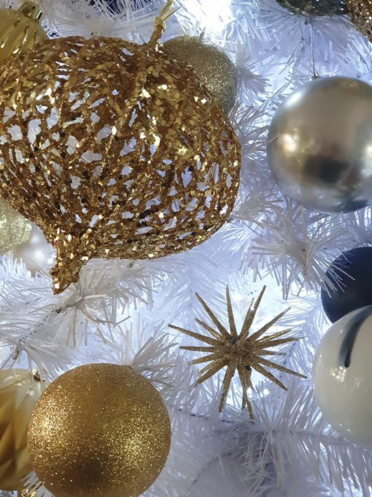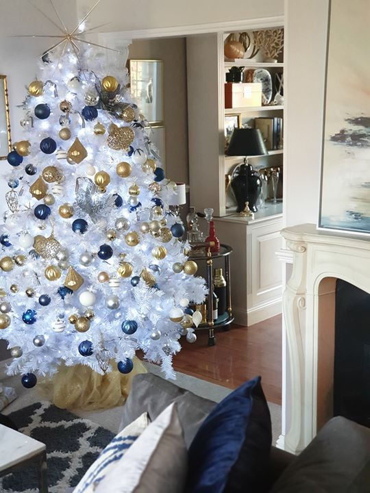 I have had my massive white tree about three years now. I have now used it's original colour scheme on the gold tree. This year I decided to go with silver, gold and navy blue. The colours work really well with my living room decor. The room itself is peaceful and neutral. Greys, whites and small pops of colour. Next year I think I want a different tree. I am crushing on this 8ft. flocked Douglous Fir.