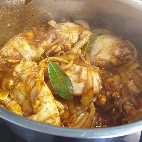 2. Add garlic, bay leaves and chicken, skin side down. Let saute a bit, you want a bit of colour on the skin, and then add rest of ingredients.